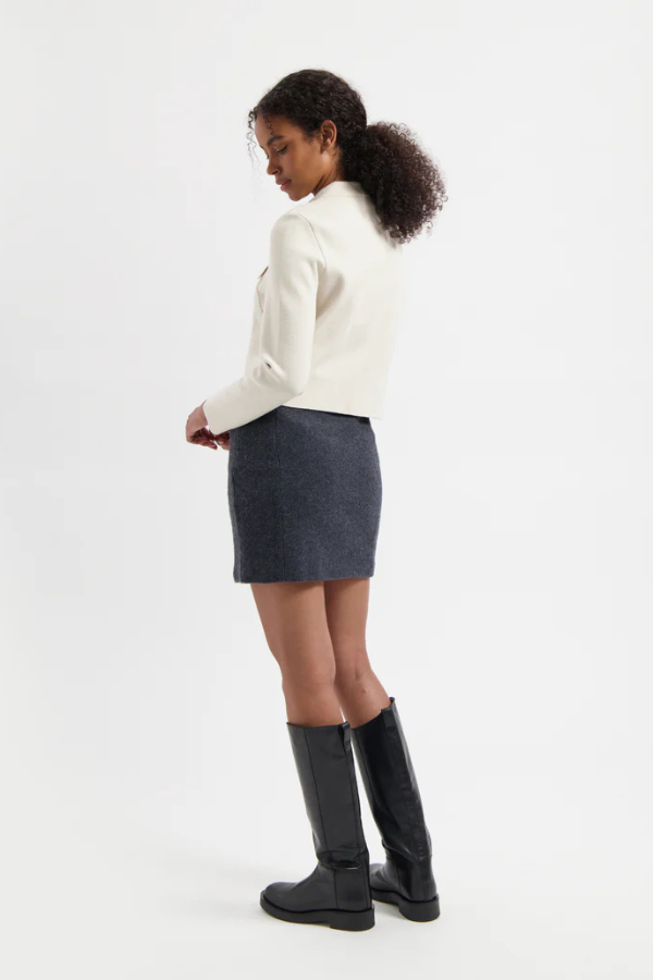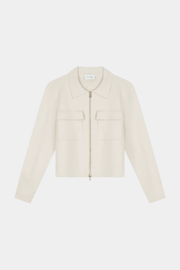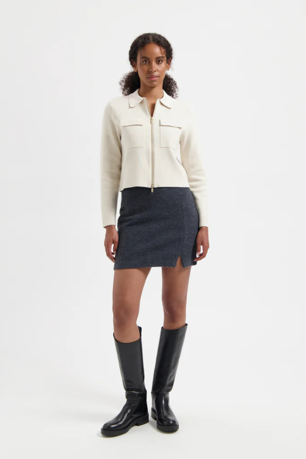 The eva cardigan is a cropped cotton-blend design with flap pockets and a golden zip detail. Its textured fabric provides both shape and softness, creating a clean, modern silhouette for transitional dressing.